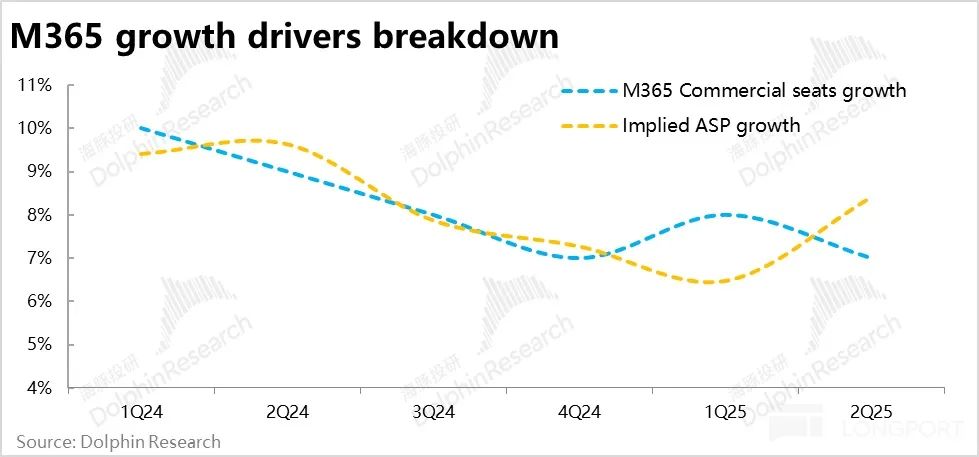 从量价角度拆分来看,客单价的提升的本季增速超预期的主要功臣:1)据公司披露,企业 M365 的订阅坐席数量本季度同比增加了 7%,较上季下滑 1pct,依然在历史低位;2)对应着,平均客单价的同比上涨了 8.4%,相比前两个季度的 6%~7% 有明显的拉升。基于此,海豚投研认为,E5 等高单价产品和 Copilot 功能的渗透率提升都可能有所贡献。管理层在电话会中也验证了我们的猜测。