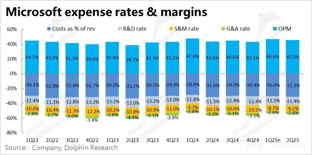 费用角度,除了研发费用大体和营收增长同频,不算吝啬外,营销费用和管理费用分仅别同比增长了 3% 和-8%,明显低于营收增速。无论是出于 AI 带来的增效,或是公司出于对冲 AI 大量 capex 投入的需求,主动裁员&控费的选择,结果是通过在营销和管理费用上的管控,挤出了约 1.6pct 的额外经营利润率。使得本季度微软整体经营利润$317 亿,高出预期的 301 亿约 5%。
