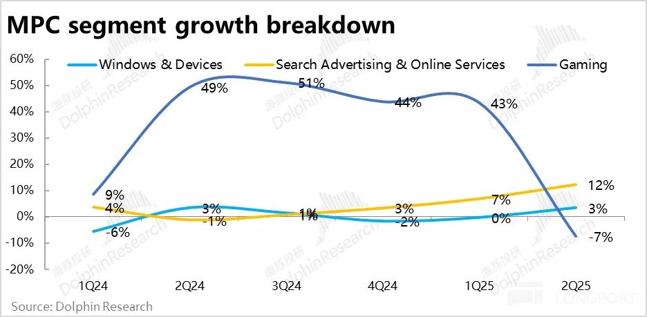 具体来看:1)并表影响消退后的游戏业务增速从先前的 40% 以上,回落到了-7%,游戏业务仍然面临着不小的困难;2)Windows 和相关硬件设备合计收入增长 3%,较先前稍有改善。但能否实质性脱离低个位数增长,仍需 AI PC 概念能否带动个人电脑需求的显著改善。