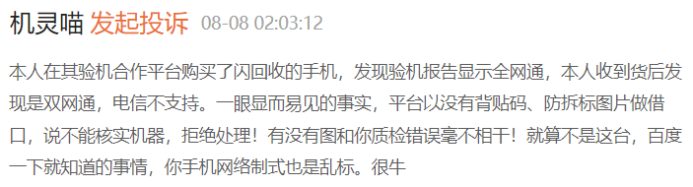有从闪回收平台购得二手手机的消费者表示,“在其验机合作平台购买了闪回收的手机,发现验机报告显示全网通,收到货后发现是双网通,电信不支持。一眼显而易见的事实,平台以没有背贴码、防拆标图片做借口,说不能核实机器,拒绝处理!有没有图和你质检错误毫不相干!就算不是这台,百度一下就知道的事情,手机网络制式也是乱标。”