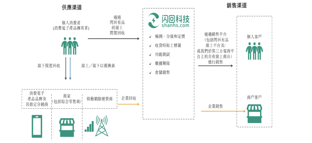 具体来讲,闪回科技现旗下拥有“闪回收”和“闪回有品”两大核心企业品牌——前者是开展线下回收业务,通过上游资源合作伙伴从个人消费者回收二手消费电子产品的主要品牌;后者则是闪回科技在自有线上平台及/或在第三方电子商务平台上的自有网店向客户销售采购的二手消费电子产品的主要品牌。