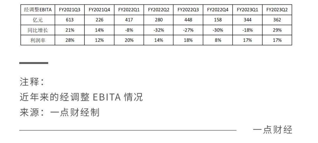 如今来看,这是一份稳中增长的成绩单。财报显示,阿里的经营利润为251亿元,同比增长68%,增幅101亿元,主要原因是经调整EBITA增长81亿元,以及股权激励费用减少23亿元。2023财年第二季度,阿里经调整 EBITA同比增长29%至362亿元,经调整EBITA利润率提高3个百分点至17%。