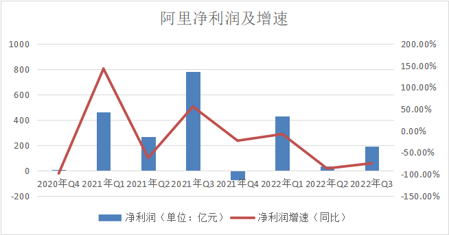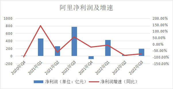 财报披露,2022财年Q3阿里归属于普通股股东的淨利润为人民币 204.29 亿元(32.06 亿美元)及淨利润为人民币 192.24 亿元(30.17 亿美元),同比分别下降 74%及 75%。