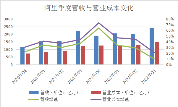 不过,在行业大趋势下,过去一年互联网行业纷纷告别曾经的高增长模式,转向关注质量。阿里同样如此,对比阿里营收与营业成本的变换趋势,两者明显同步,成本与营收同步收窄。