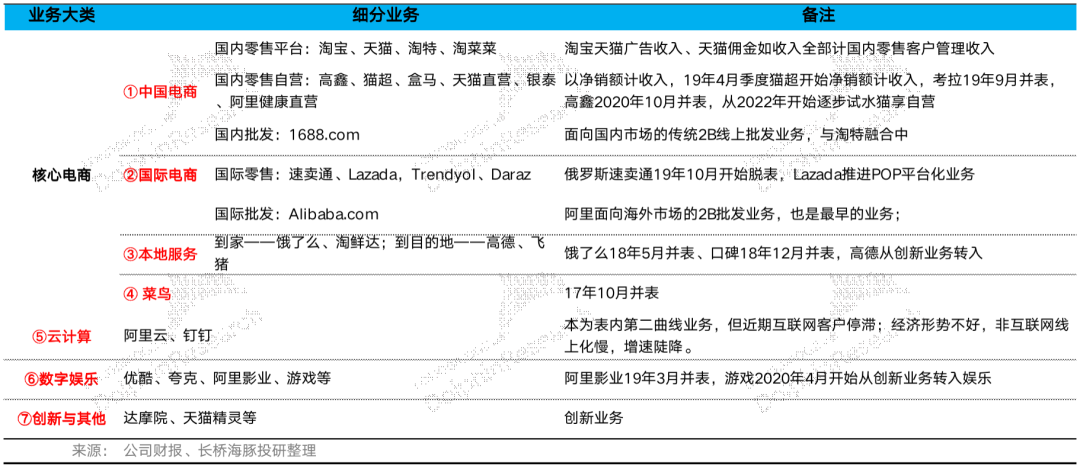 特别提示:从2021年12 月的季度开始,阿里调整财报的露口径。海豚君把阿里最新业务做了分类整理,方便大家在看解读的时候,随时回溯,红色为最新的披露列示条目。
