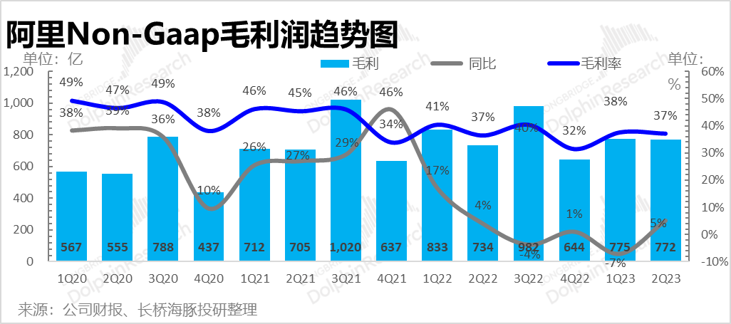由于花钱不再大手大脚,阿里本季度剔除掉股权激励的 Non-GAAP 毛利772 亿,同比增长5%;毛利率在低毛利自营收入占比同比环比都在加大的情况下,环比基本稳住,同比还有改善,明显超出了市场预期,这应该是自营业务,譬如盒马毛利率的改善,起到了很大的作用。