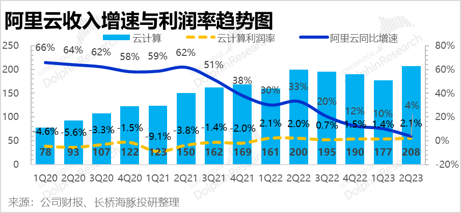 作为原本的明星业务,这个季度的阿里云如同是增速下行的穿云箭,在增速滑坡路上停不下来。这个季度营收208亿,同比仅增4%。