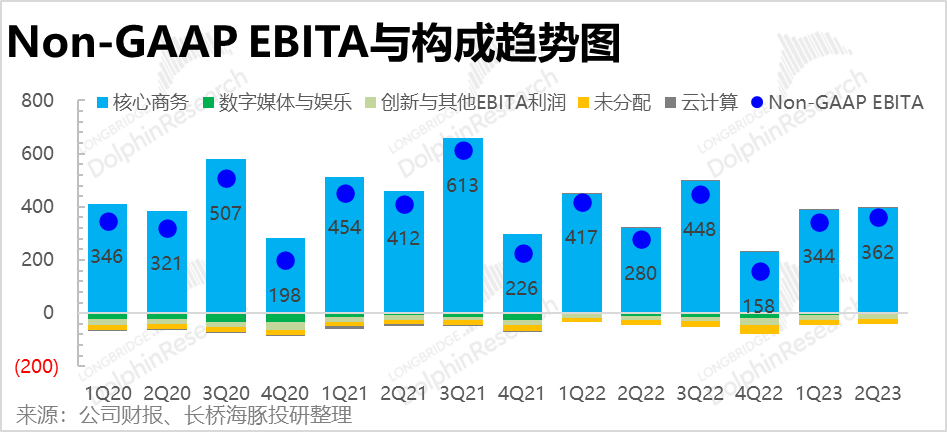 这个季度国内商务不考虑期权激励、摊销费用的利润(经调整EBITA)达到了440亿,利润率32%,无论是同比环比都有明显提升。