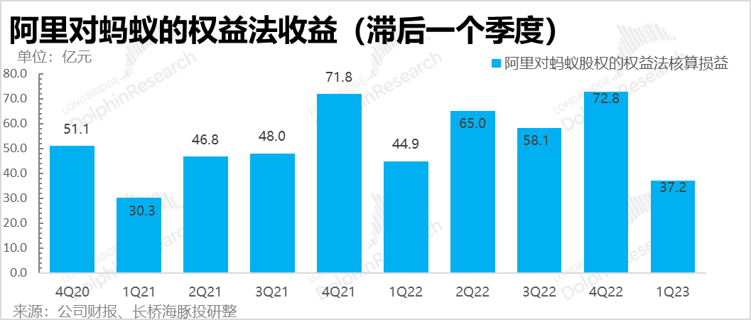 这个季度阿里计入蚂蚁得权益法收益只剩24亿,按照33%的股权占比,相当蚂蚁利润应该只有72亿,同比下滑了64%,不止腰斩。这里除了蚂蚁本身运营利润的缩水,还有蚂蚁所投资产公允价值的下滑。