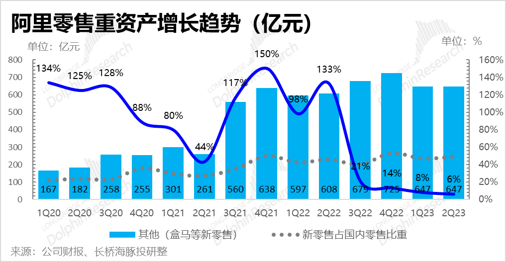 这个季度重资产零售业务收入依然是 647 亿,走出上海疫情后增长进一步放缓。由于高鑫是-2%左右的收缩,海豚君估计主要的增长贡献应该是来自于盒马,按照盒马10-15%左右的收入增速推算,隐含阿里的自营电商(银泰、猫超自营、天猫自营、考拉)增速并不是特别顺利。