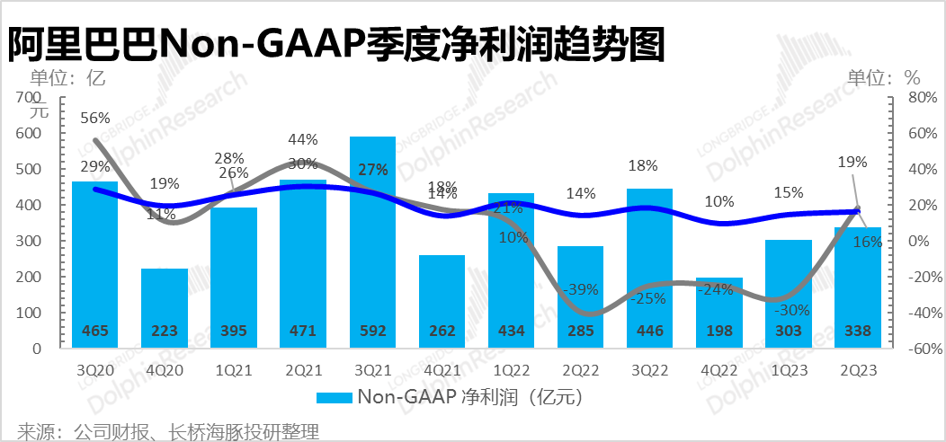 这也说明,市场对于阿里没有收入拐点而单纯靠对内裁员、节衣缩食+对外缩减广告费用和用户补贴式的利润释放并不满意,毕竟没有收入的利润释放,持续性是个很大的问题。