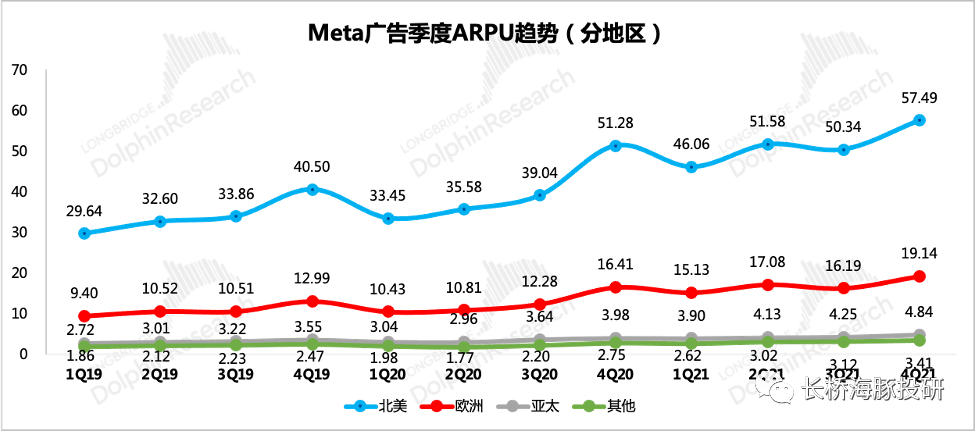 四季度Meta实现广告收入326亿美元,同比增长20%。剔除意外超指引的其他收入(10.3亿)后,广告收入表现很一般。虽然华尔街以及一些广告主对Meta应对苹果iOS隐私政策的效果期待较高,但从结果来看,Meta还需要时间去修复。