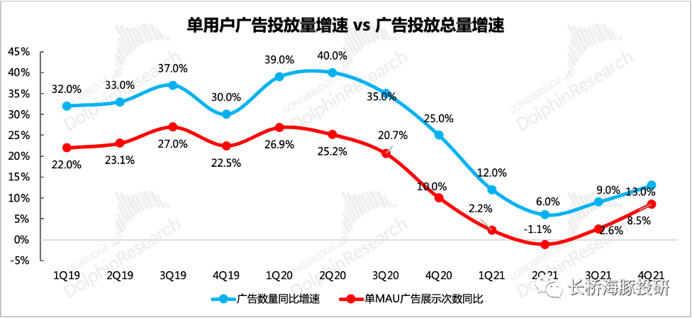 四季度单用户广告投放量同比增长8.5%,在流量增长遇到瓶颈时,广告总量开始靠填充广告位来实现增长。