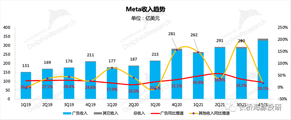1)总收入同比增20%达336.7亿美元,略高于彭博一致预期的334亿美元;预期差主要来自于支付及其他收入(包含Oculus),原本指引可能会同比下降,实际增长16.6%。拆分来看,圣诞季热卖的新款Quest 2贡献最大。