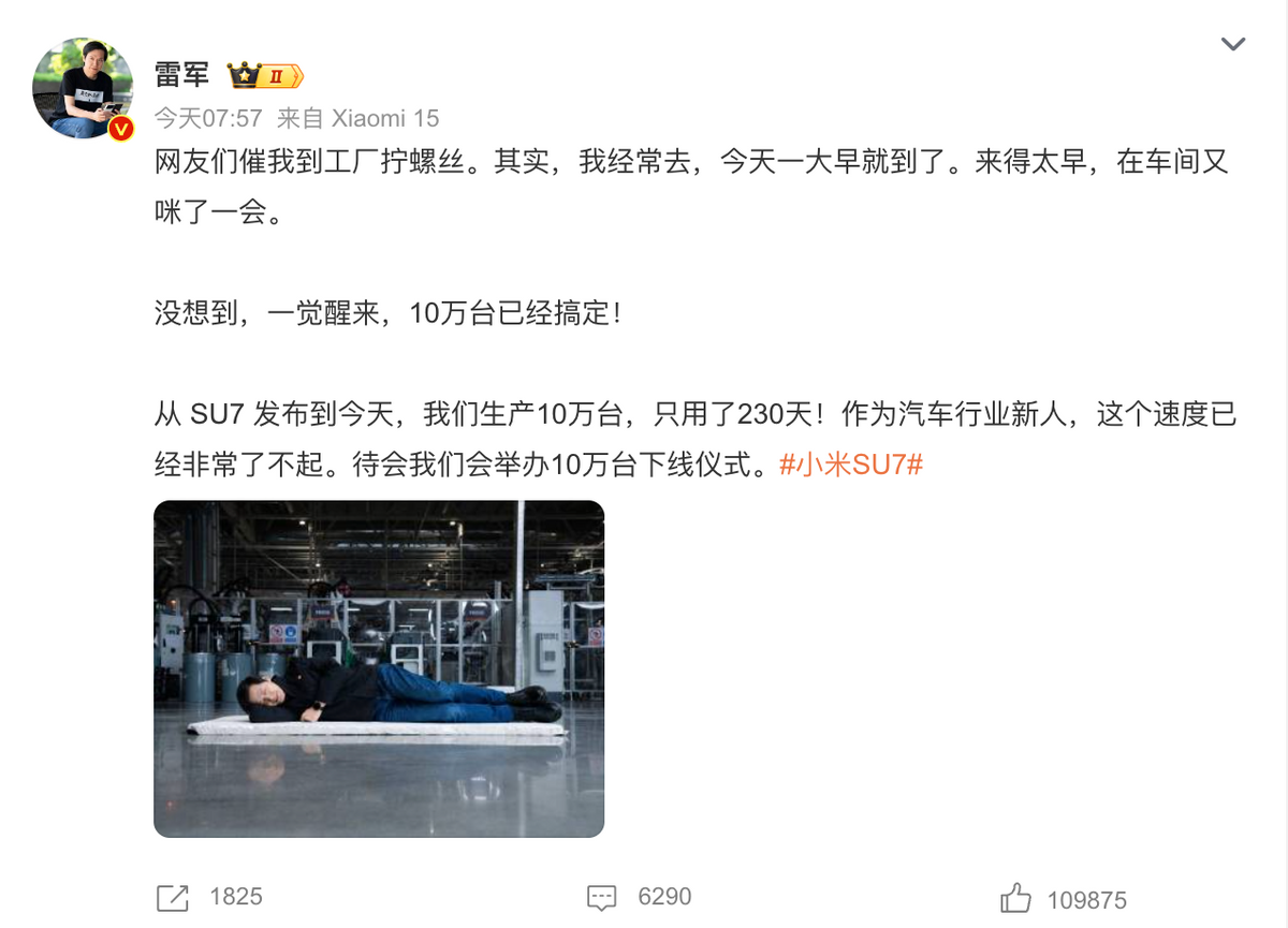 有一些新闻敏感度的小伙伴都知道,这是一次品牌策划的营销事件。雷军之所以会发这条微博,是因为小米SU7迎来了“10万台下线仪式”。如果单纯说10万台下线,外界没什么感知,这个数量在月销50万辆的比亚迪面前更是不值一提。配合老板打螺丝、睡地板这话题,小米SU7 10万台下线以及小米想传递的信息,就出去了。