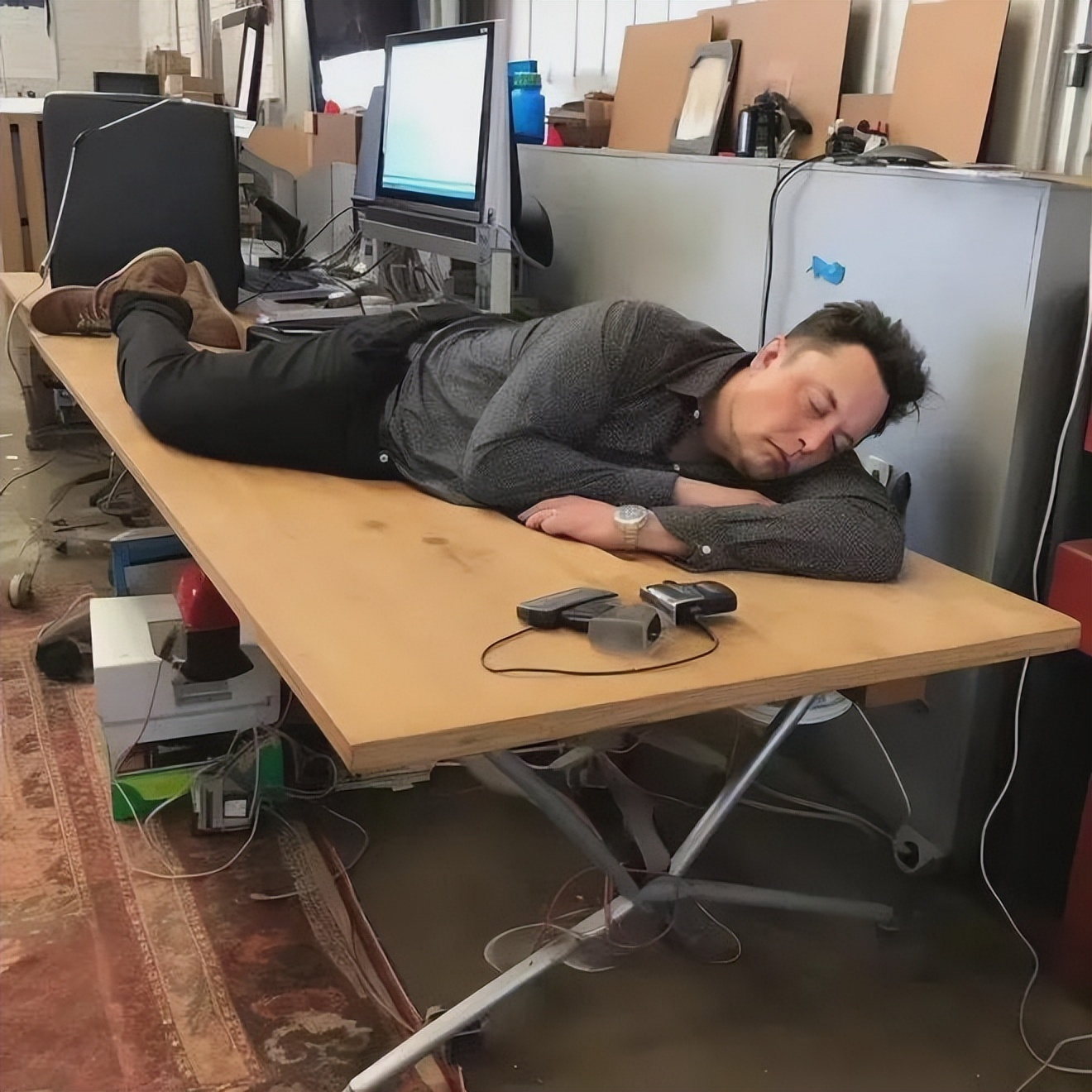在工厂沙发上,在办公桌上,在临时床垫上,马斯克这人,睡觉不认床。
