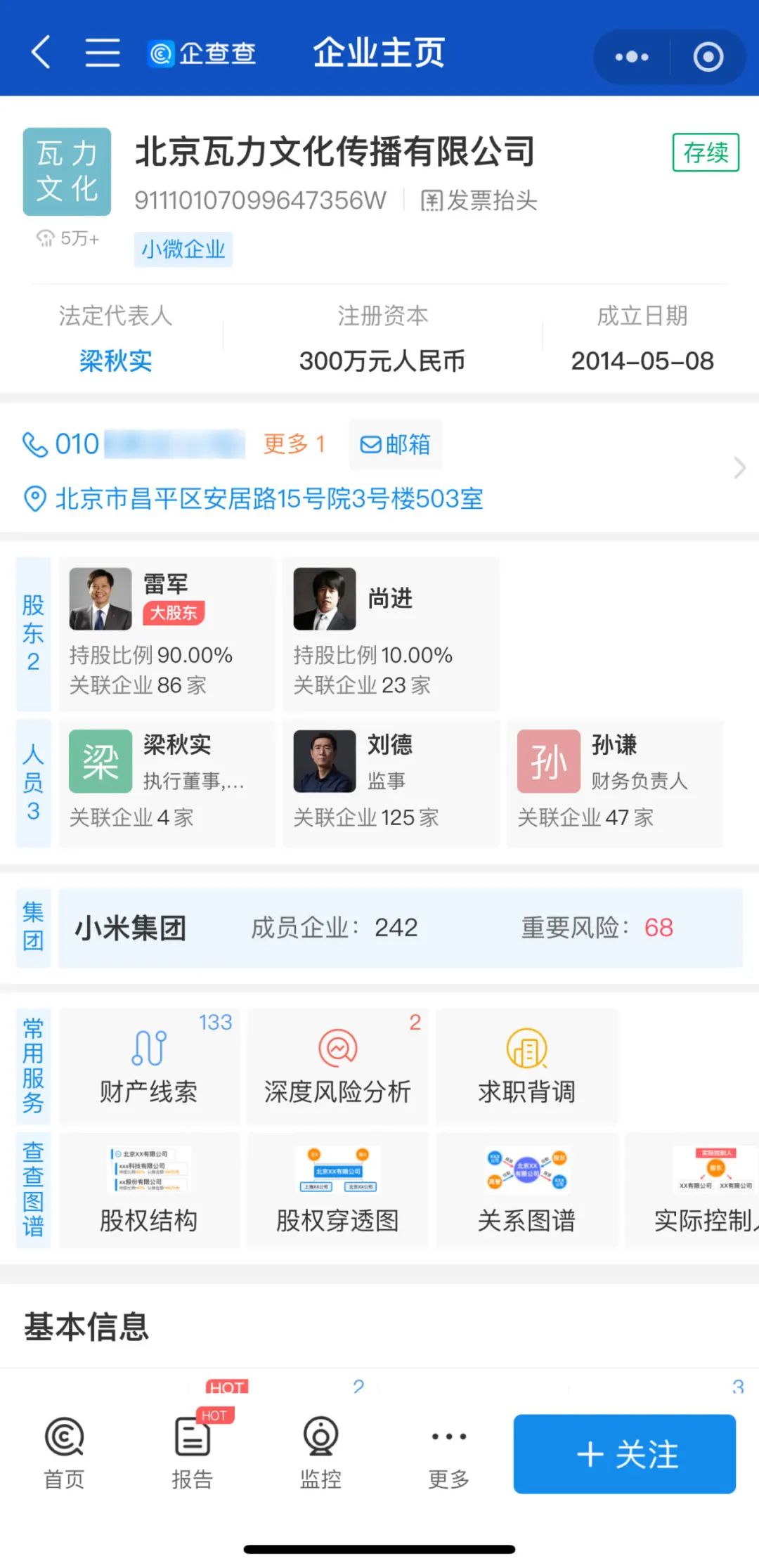 企业信息穿透后发现,该公司法定代表人为梁秋实。股东有两人,大股东是雷军,另外一人为尚进。公开资料显示,梁秋实现为小米互联网业务部副总经理、小米南京区域总部总经理;尚进是知名游戏制作人,也是雷军在金山时期的老部下。他先后在金山公司和搜狐领导游戏开发团队,代表作有《封神榜》和搜狐畅游的《天龙八部》。