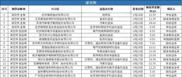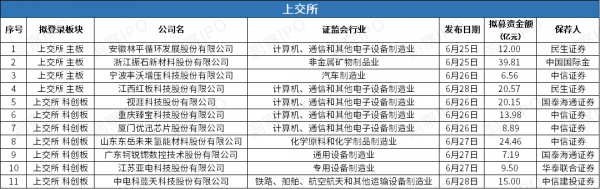 6月23日-6月29日,上交所主板有5家公司、科创板有7家公司递交上市申请;深交所主板有6家公司、科创板有12家公司递交上市申请。
