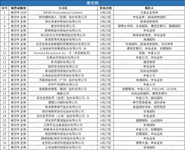 6月23日-6月29日,港交所有1家公司递交GEM上市申请、30家公司递交主板上市申请,其中有8家公司拟冲击A+H。