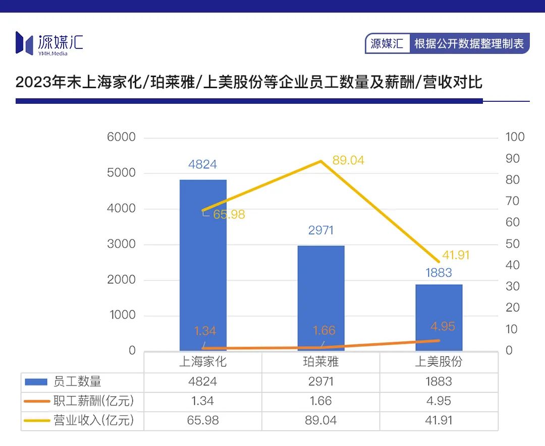 上海家化2023年末的员工数量是4824名,其应付职工薪酬为1.34亿元。相比2022年,员工数下降了7.9%,薪酬总数则下降了27.2%。