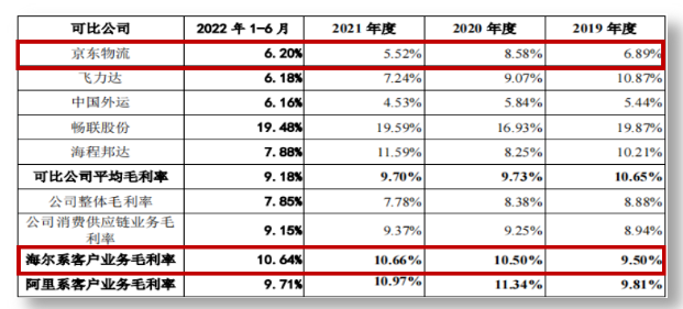 2020年-2022年期间,日日顺来自海尔系客户和阿里系客户的收入一直占到公司总营收的50%左右。同期,由海尔系客户贡献的毛利占比分别为41.48%、41.90%和42.69%。
