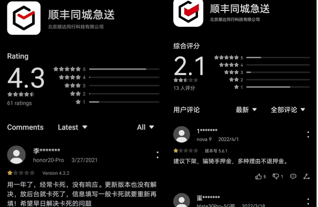 有趣的是,对比2021年,2022年顺丰同城在华为应用市场的下载界面上除了自身LOGO的对勾有些许不同之外。评分也从2021年的4.3分降至2022年的2.1分,评分人数从61人降至13人。