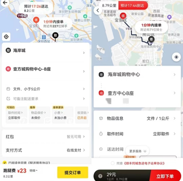 除此之外,《港湾商业观察》下载顺丰同城与美团APP后对比发现,相同的地址寄同样重量的物品,美团跑腿显示距离8.2公里,预计送达时间17:26,附近有227位骑士,价格23元。顺丰同城急送显示距离8.63公里,预计送达时间17:41,附近有71位骑手,价格29元。