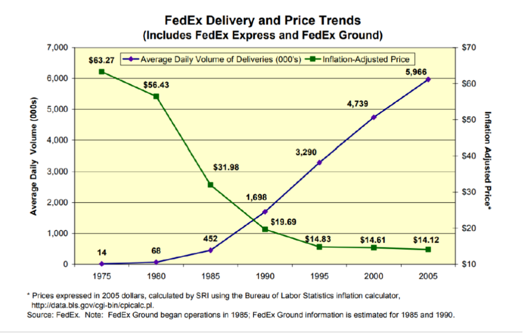 以FedEX为例,1975年单价边际收入增幅在63.27美元左右,到了2005年,业务量较30年前出现了指数级的上升,边际价值增长趋于稳定,基本上维持在14美元上下。规模效应带来的边际增幅在大幅下滑,形成剪刀差。