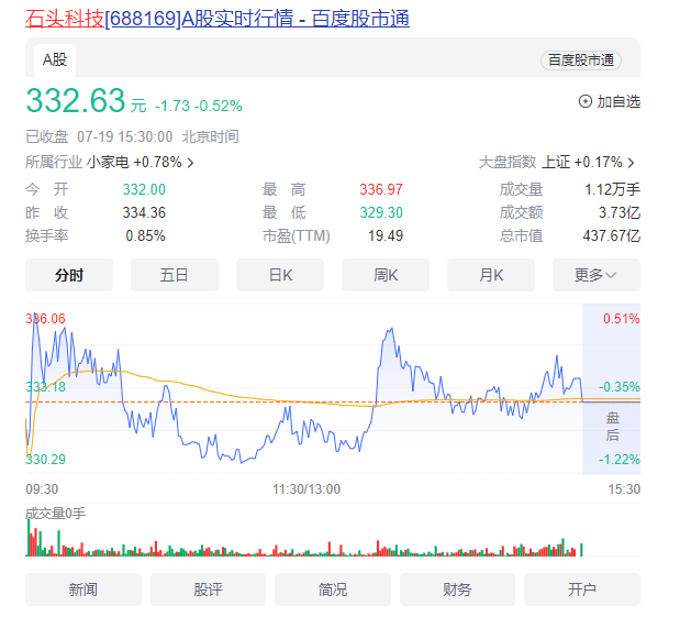 而这股盈利的“喜气”却并未传导至股市。据悉,在业绩披露的第二个交易日,石头科技收盘股价下跌9.13%。截至7月19日收盘,石头科技股价仍处于下跌状态,报332.63元/股。