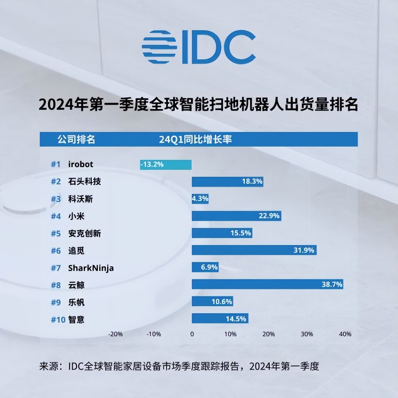 不过,如今的时代,“出海”已经是业内在共同讲述的故事,IDC报告显示,2024年第一季度,全球智能扫地机器人出货455.4万台,同比增长11.1%。而出货量跻身前十的中国厂商就有石头科技、科沃斯、小米、安克创新、追觅、云鲸、乐帆、智意。可以说,国内厂商在海外“大杀四方”之际,彼此之间的较量也在加强。