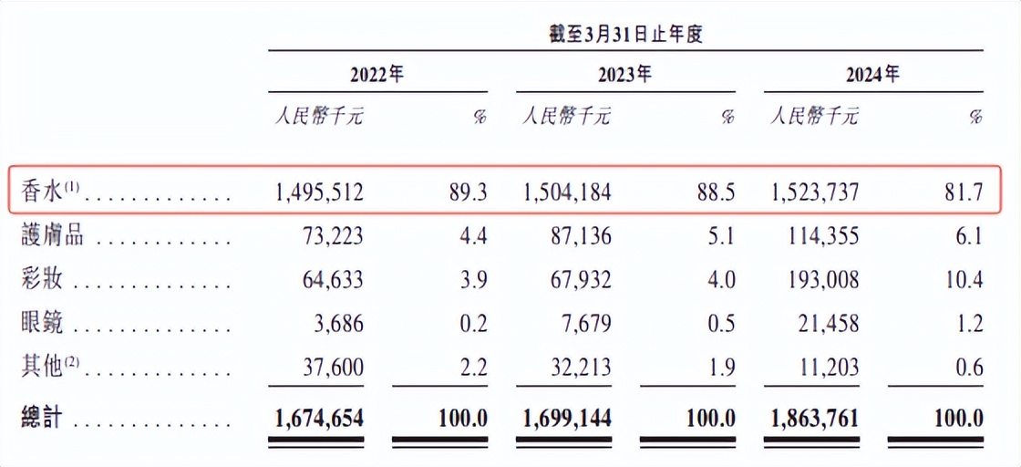 细究招股书,不难发现颖通代理的品牌虽多,但在产品上却始终依赖香水品类。截至2024年7月11日,颖通香水品牌组合多达48个品牌,截至2022年、2023年及2024年3月31日止年度,香水品类的收入占比分别为89.3%、88.5%和81.7%。