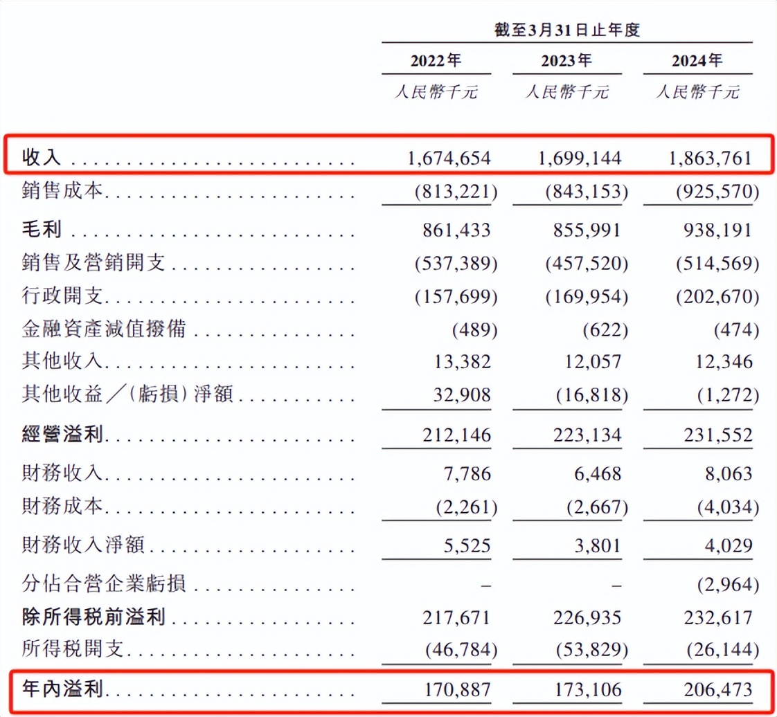 凭借管理众多国际知名品牌的竞争优势,颖通带着一份稳定增长的业绩,站到了港交所门前。根据招股书,2021财年至2023年财年,公司营收分别为16.75亿元、16.99亿元和18.64亿元;同期,净利润分别为1.71亿元、1.73亿元和2.06亿,净利润率则分别为10.2%、10.2%和11.1%。