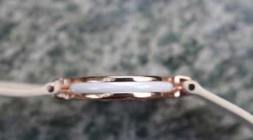 让我们具体欣赏一下镶嵌于表带中央的Amazfit月霜主体。Amazfit月霜与其说是一个手环,不如说是一个玉坠更为贴切。其采用陶瓷作为主要材质,具有硬度高、耐磨、光泽度高的特点,与我们日常生活中常见的玉坠极为类似。这样的智能手环产品,更像是一个随身配饰的艺术品,让人很难与科技感联系起来。这巧妙的错位,让Amazfit月霜完全与众不同。