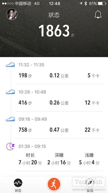 在米动APP中需要设定用户个人的身高体重等数据,用以根据不同人群的运动能力设定每日所需的目标步数。比如笔者就被贴心的设定为8000步,而每天至少走完这8000步,保持基本的运动消耗,也就成为了每日的必修课。