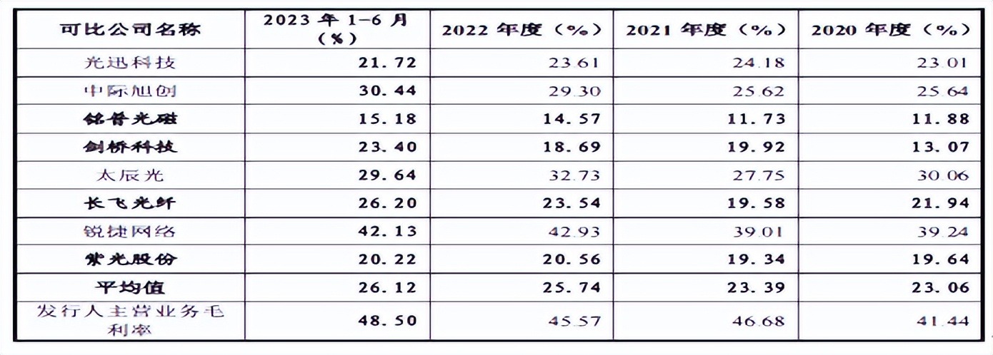 报告期内,公司主营业务毛利率分别为41.44%、46.68%、45.57%和48.50%。而可比公司的毛利率均在19.34%至26.12%之间,飞速创新的毛利率超过了行业平均值20个点,显现异常高的状态。而
