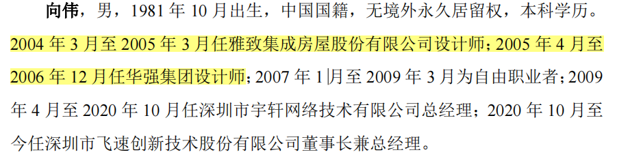 宇轩有限于2009年4月9日由向伟以货币出资10万元设立。2020年10月21日,宇轩有限整体变更为飞速创新。截至招股说明书签署日,向伟直接持有公司股份20,392.8528万股,占股份总数的56.6469%,通过担任宇轩成长、宇轩进取及宇轩稳健普通合伙人间接合计控制公司4.5089%的股份,合计控制公司61.1558%的股份,并担任公司的董事长、总经理,因此,向伟为公司的控股股东、实际控制人。