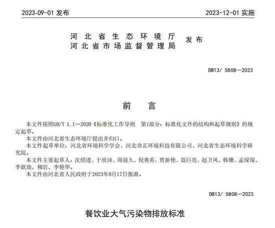 近日,河北省生态环境厅发布地方标准《餐饮业大气污染物排放标准》,该标准将自2023年12月1日起实施。