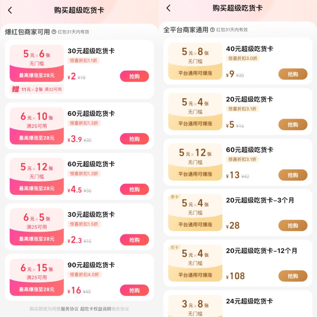 金色是超级吃货卡的A面,全平台通用属性带有明显的普惠性质,对于绝大部分用户而言,5元折扣确保了省钱的下限;红色是B面,“最高爆涨金额足够高+日常爆涨金额也够高”的玩法,对于价敏用户有极高的吸引力,平台也能给商家提供定向转化。