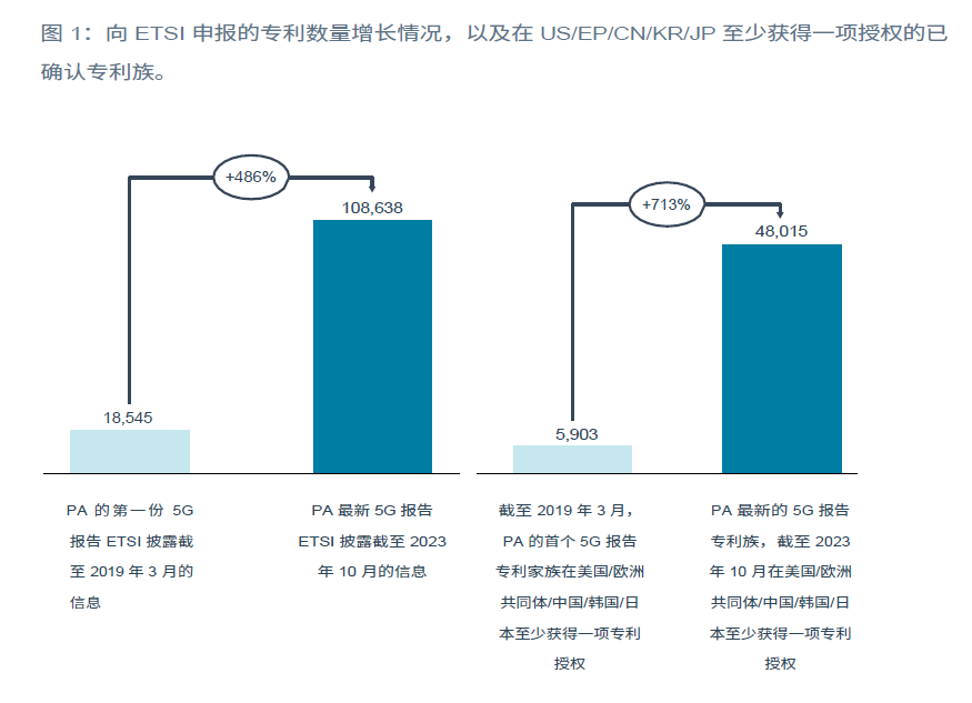 数据显示,2019年时,各大企业的专利数量仅5903件,但到2023年10月份,增长713%,达到了48,015件,而总的向ETSI声明的专利数量,更是增长486%,高达108638件。