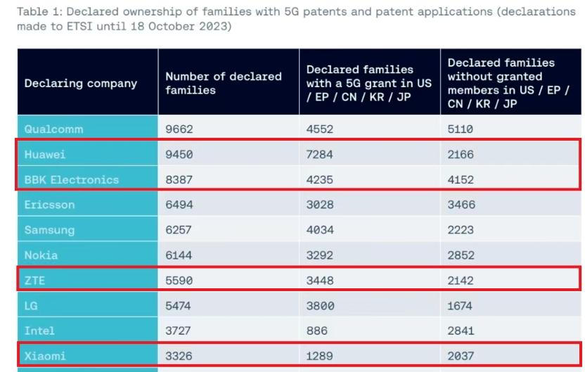 具体的前10大企业排名如上图,可以看到,高通、华为之后,再是步步高、爱立信、三星、诺基亚、中兴、LG、intel、小米。前10大企业中,中国有4家上榜。