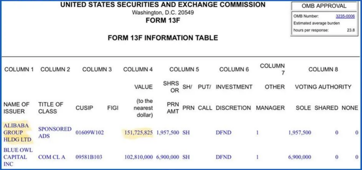 北京时间1月23日晚间,美国证监会网站一份13F文件显示,2023年第四季度,蔡崇信家族基金Blue Pool增持了价值约1.517亿美元的阿里巴巴在美国上市的股票。