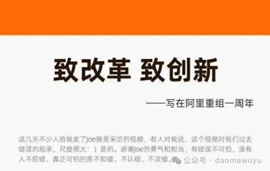 在阿里巴巴重组改革一周年之际,马云在公司内网发表题为《致改革 致创新》的帖子。马云称,过去25年阿里巴巴人造就了多次成功,有过很多创新和领先,但这个过程也经历了无数次犯错,未来也还会一路犯错。这其实也可以看作是一种反思亦或者反省,对于任何企业来说,犯错误都是难免的,关键的是如何找到正确的方向,只有确立了正确的方向,才能一往无前地走下去。方向决定了高度,以及未来的使命和成就。