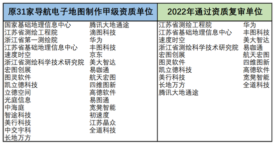 2022年,导航电子地图制作甲级资质单位面临重审,2021年已经获得该资质的单位数量,从31家获得该资质的单位收紧为19家。