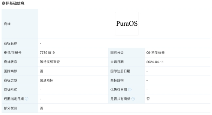 除了新注册申请“PuraOS”之外,华为近期也注册申请了“Pura”、“HUAWEI Pura”等商标。