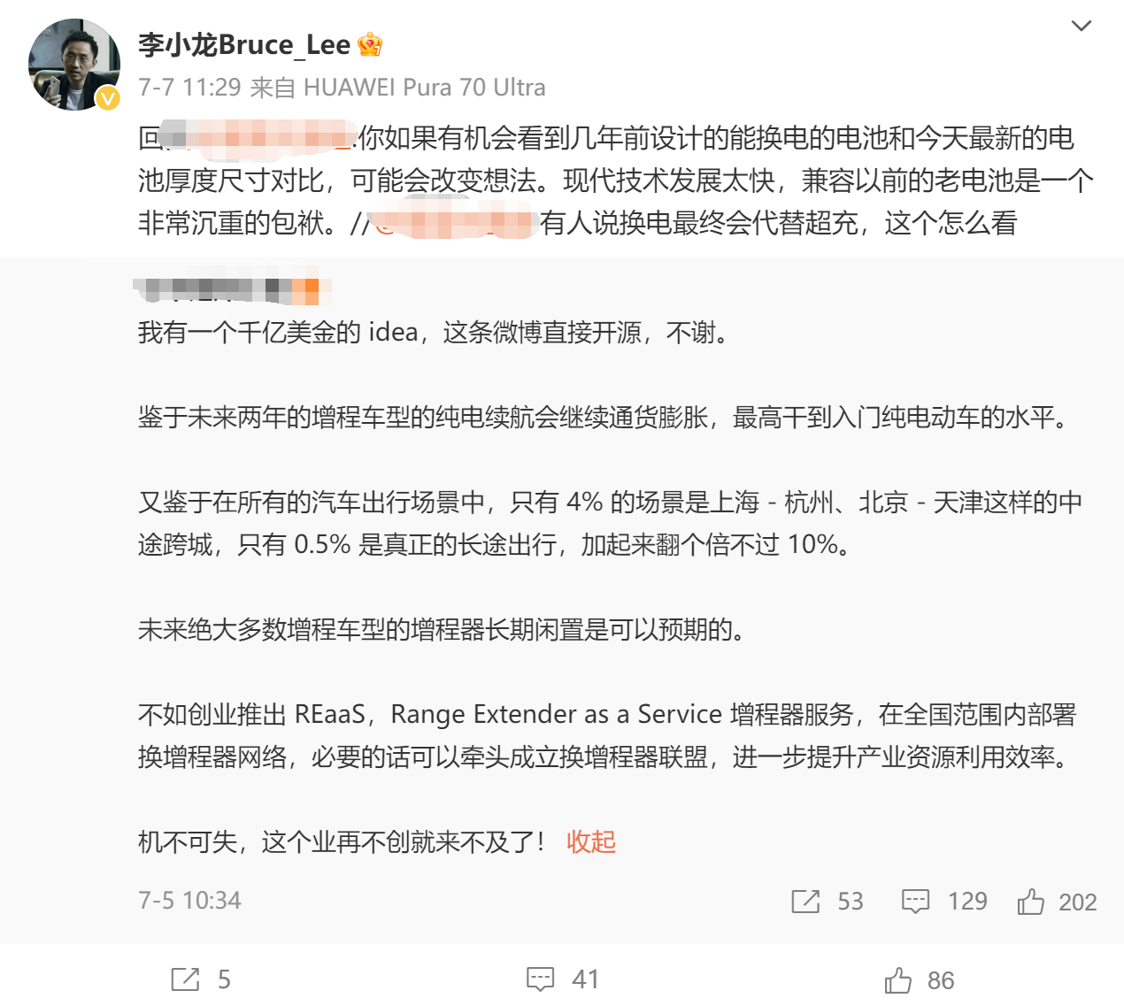 前段时间华为与蔚来高管就换电模式争论,原因就在于华为终端BG CTO李小龙认为,电池技术正在飞速发展,兼容老旧电池的尺寸将会成为沉重的包袱。蔚来副总裁沈斐反驳称,在自己不熟悉的领域,不要轻易发言,否则大概率专家变砖家。但很明显,沈斐没有直接回应该如何解决老旧电池的兼容性问题。