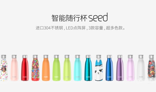 而此次发布会更重点的一款产品则是Seed智能随行杯。Seed主打出行人群,在杯上加入了杯盖。杯体采用304不锈钢材料,拥有三款不同的容量,多种色彩,多种图案的款式,并且还支持各种品牌定制。麦开此次创造性的将所有的电子元器件都集成在了杯盖中。杯盖上加入了LED点阵屏幕,同样可以显示水温、饮水量等信息;为了保证续航,Seed使用了锂锰电池,官方宣传续航可以达到一年。