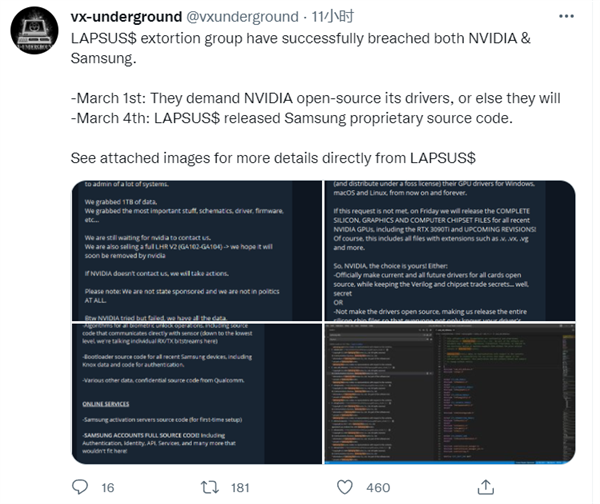 3月7日消息,专业收集恶意软件样本的网站vx-underground在社交媒体发布消息,称目前正在攻击NVIDIA的黑客组织LAPSUS$将矛头指向了三星。