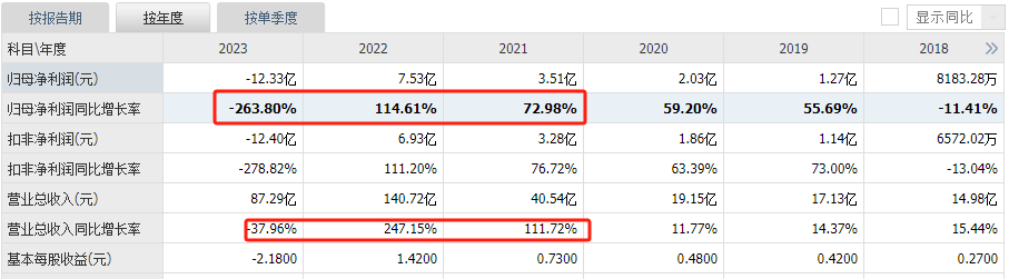 从基本面来看,相比2022年,龙蟠科技实现收入、盈利同比大增,2023年度其营收由2022年的140.72亿元大幅下降至87.29亿元,尤其是其同期归母净利润由10.30亿元的盈利扭亏至15.14亿元的亏损。
