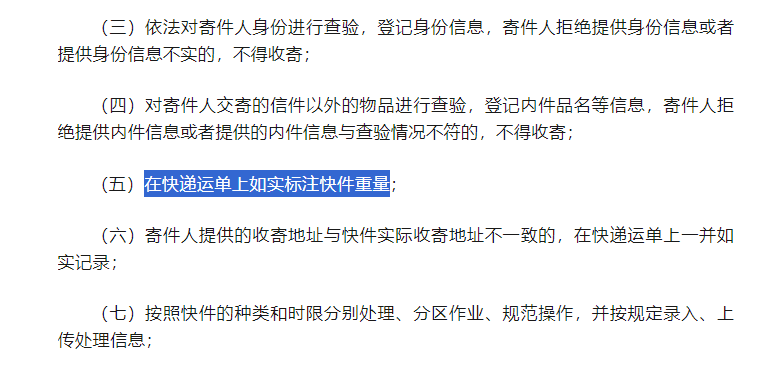 《快递市场管理办法》第二十六条明确规定,“在快递运单上如实标注快件重量。”