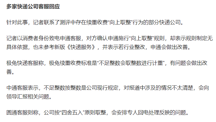 对此,申通、极兔、中通、圆通客服回应称确实存在向上取整,申通表示行业整改申通则改,极兔表示有问题会改,中通说会向领导汇报相关情况,圆通会安排专人处理问题。